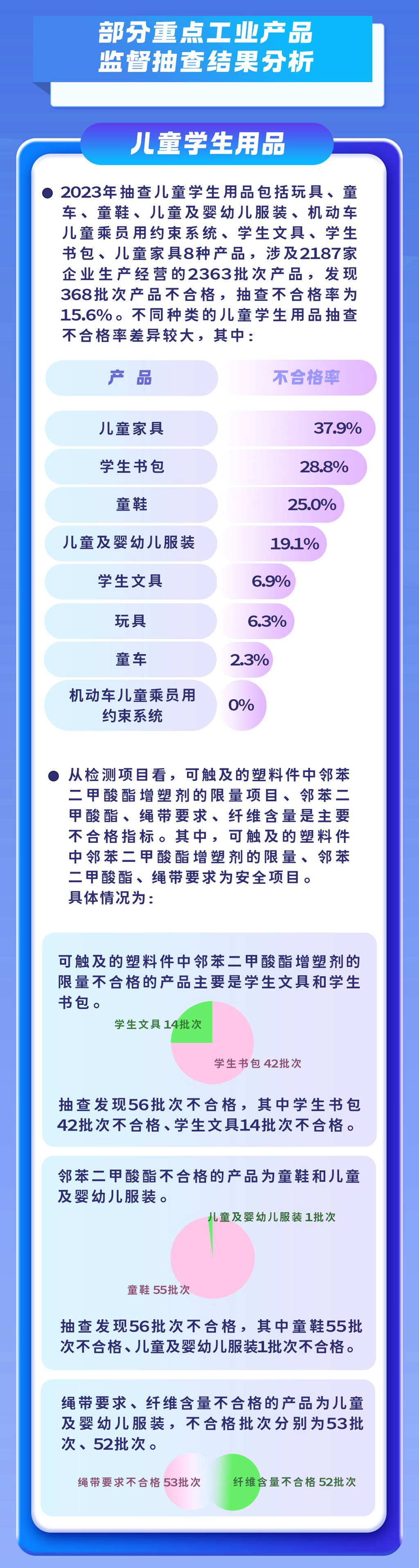 2023年抽查儿童学生用品包括玩具、童车、童鞋、儿童及婴幼儿服装、机动车儿童乘员用约束系统、学生文具、学生书包、儿童家具等8种产品,抽查不合格率为15.6%。
