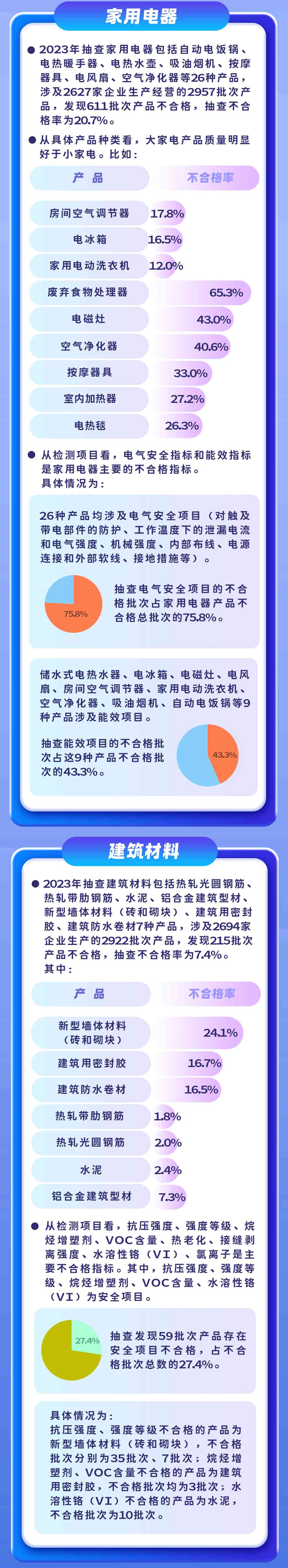 2023年抽查家用电器包括自动电饭锅、电热暖手器等26种产品,抽查不合格率为20.7%。从具体产品种类看,大家电产品质量明显好于小家电。从检测项目看,电气安全指标和能效指标是家用电器主要的不合格指标。家用电器产品不合格的主要原因主要有使用的配件不满足标准要求;质量管理能力不足,产品设计不合理;产品能效水平名实不符。