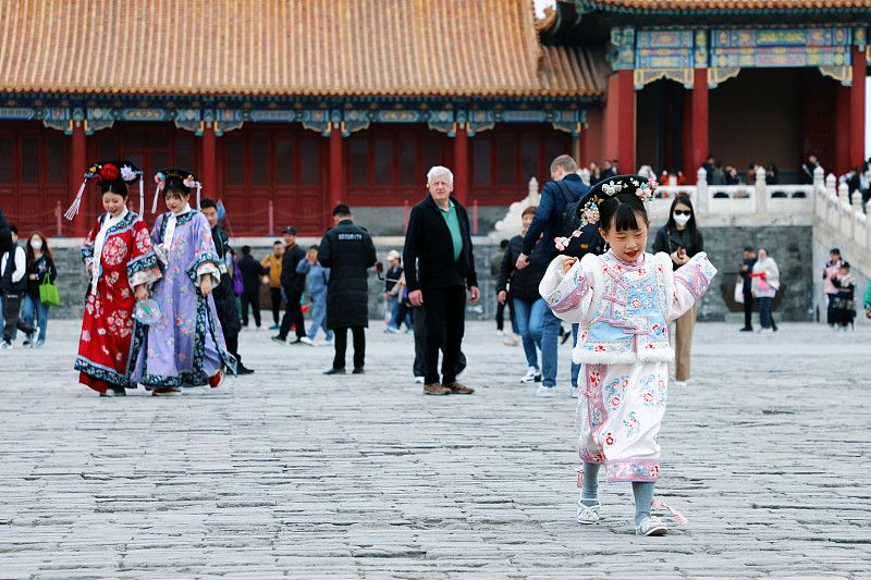 2024年4月4日,北京,清明小长假,游客身着古装在故宫博物院游玩,体验穿越古代的新奇感,展示传统民族服饰及国风国潮魅力。