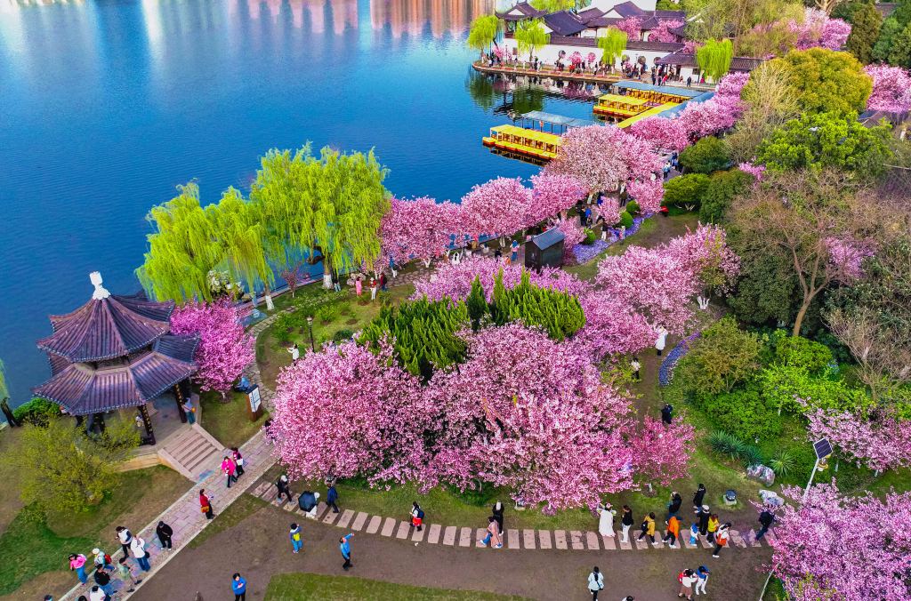 2024年4月5日,南京,清明时节,江南古典名园——莫愁湖公园内,海棠花竞相绽放,姹紫嫣红的花海吸引无数市民和外地游客争相观赏。