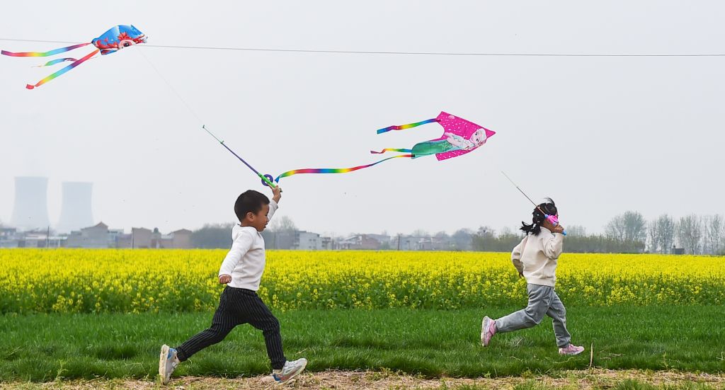 2024年4月5日,洛阳市,孟津区白鹤镇,小朋友在油菜花种植基地休闲赏花游玩。