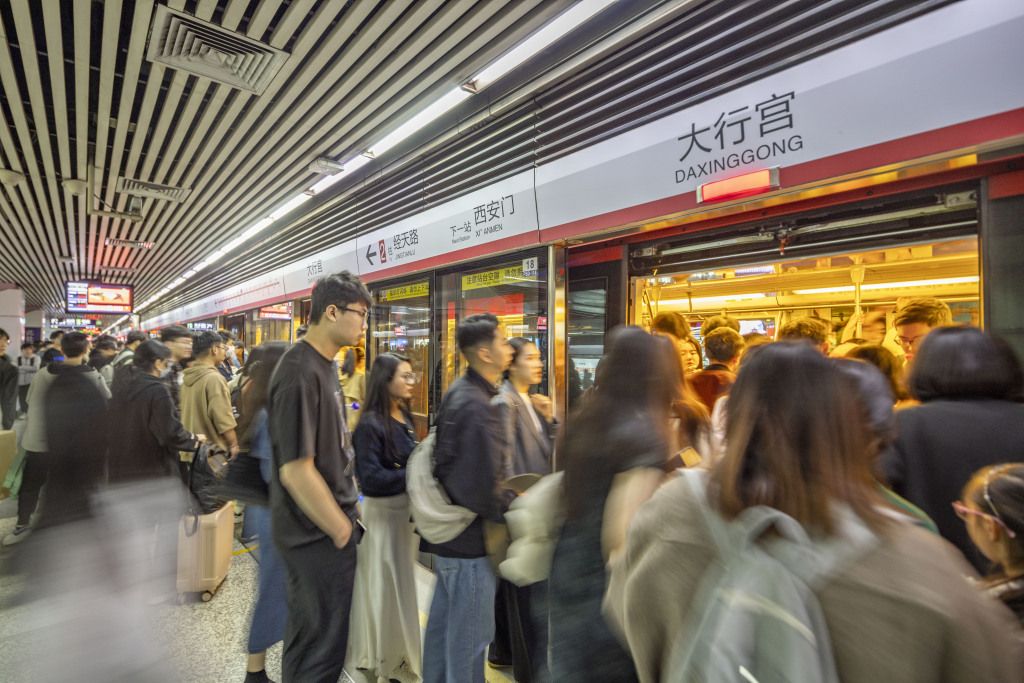 2024年4月5日,清明小长假第二天,南京地铁迎来客流高峰,乘客有序排队进出站、上下车。