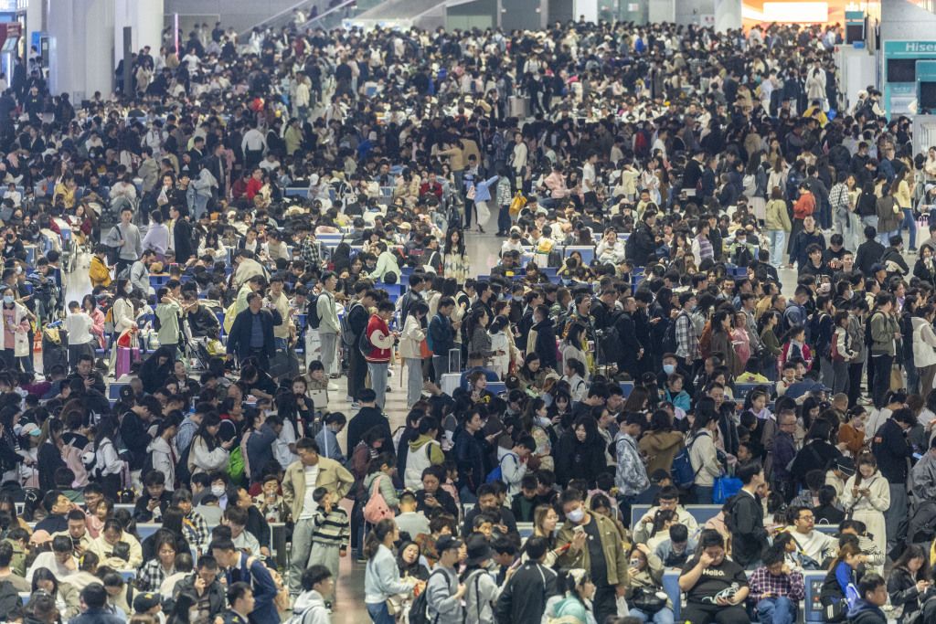 2024年4月5日,清明小长假第二天,南京南站继续迎来客流高峰,车站候车大厅内爆满,旅客有序排队候车。