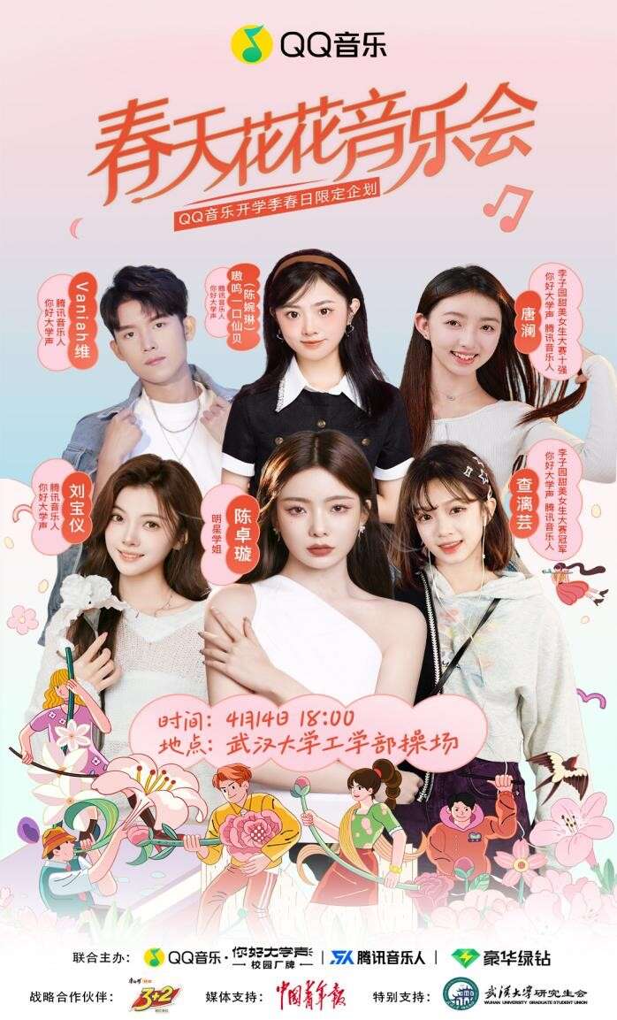 中国青年报客户端讯(中青报·中青网记者 蒋肖斌)QQ音乐“春天花花音乐会”将于4月14日在武汉大学开唱,与学子们共同度过2024春日的尾巴。“明星学姐”陈卓璇、“你好大学声&腾讯音乐人”嗷呜一口仙贝(陈婉琳)、刘宝仪、唐澜、Vaniah维、查漓芸等,将同台为大家带来精彩演出。
