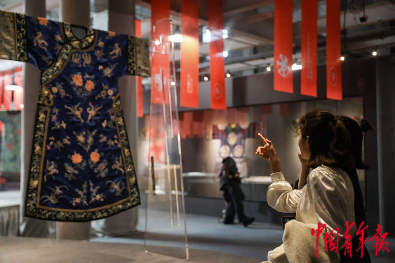 4月6日,北京,“千人千面”民族服饰展现场,两名参观者在一件清代的蓝缎地绣花蝶纹氅衣前驻足观赏。这场展览展出了我国18至19世纪的织绣、首饰、器皿共300余件,全景式呈现了当时从王公贵族到寻常百姓的服装制式和工艺。通过观看这些“穿在身上的历史”,今天的年轻人们得以体会那个年代的民族文化、艺术与风情。中青报·中青网记者 孔斯琪/摄