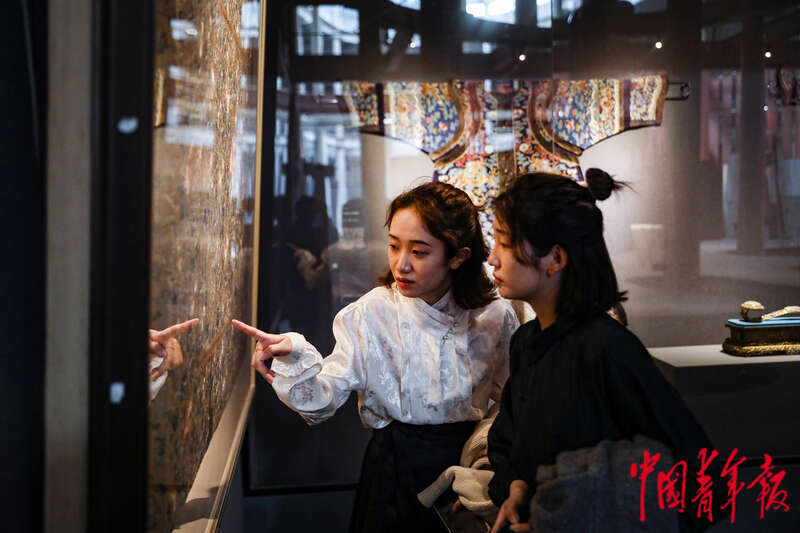 4月6日,北京,“千人千面”民族服饰展现场,两名汉服爱好者在观赏一件明黄地绣缠枝莲蝠纹坐垫,当天她们特地穿着了马面裙和新中式风格的服装前来观展。 中青报·中青网记者 孔斯琪/摄