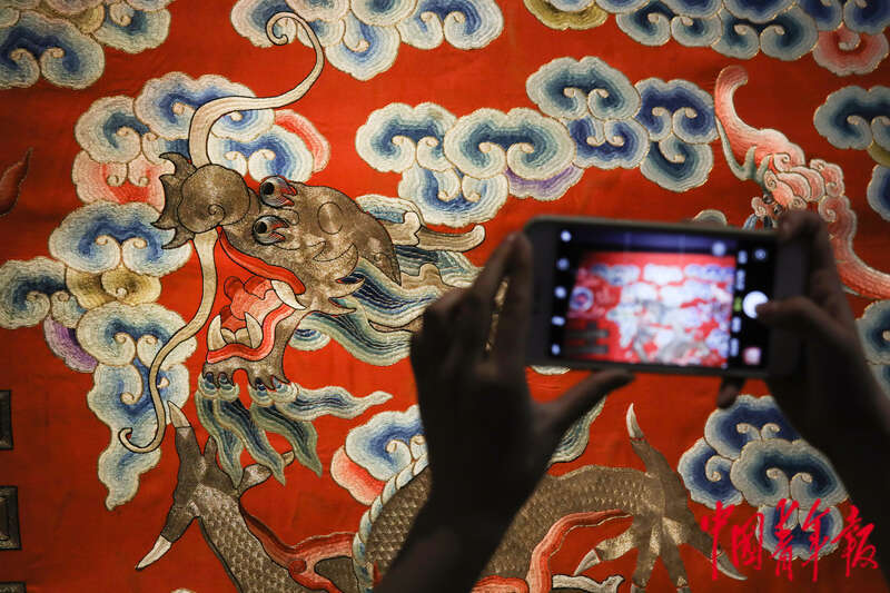 4月6日,北京,“千人千面”民族服饰展现场,参观者在拍摄一件红缎地绣龙云纹绣片的局部。中青报·中青网记者 孔斯琪/摄