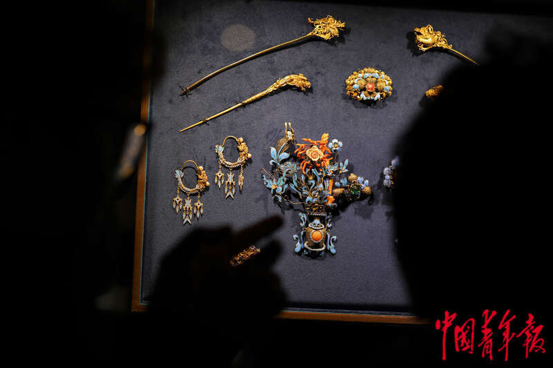 4月6日,北京,“千人千面”民族服饰展现场,参观者在观看一组金银混搭累丝嵌宝头面首饰。中青报·中青网记者 孔斯琪/摄