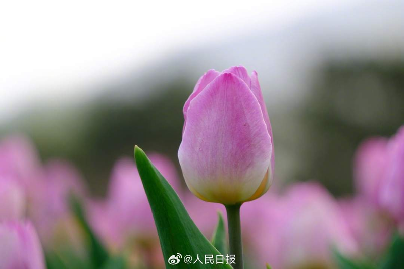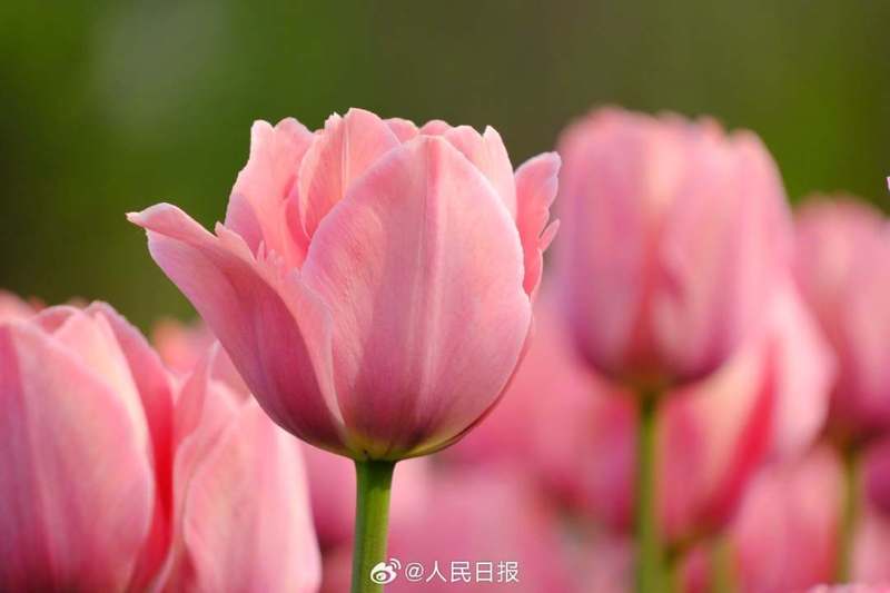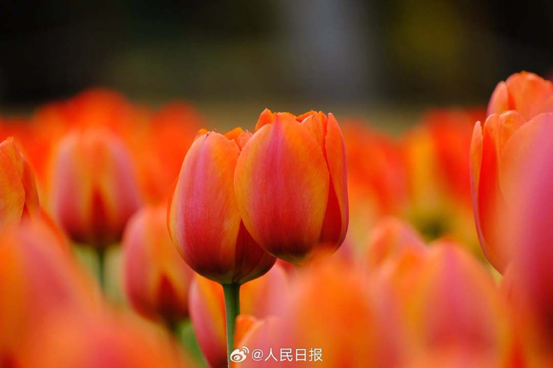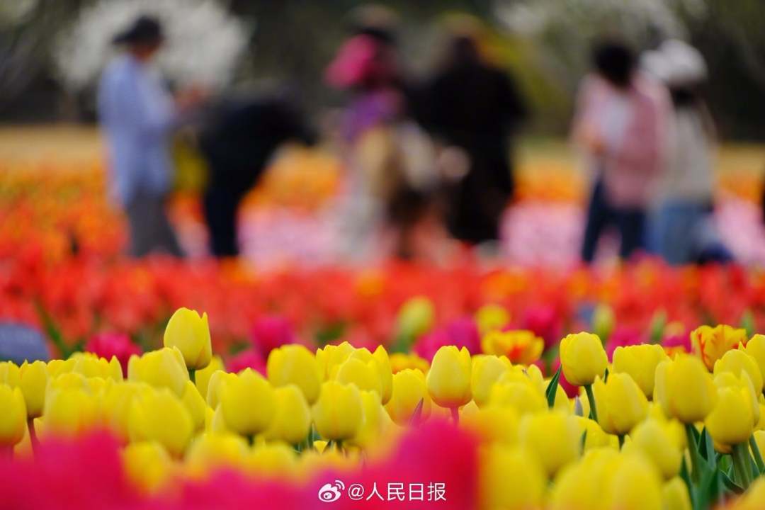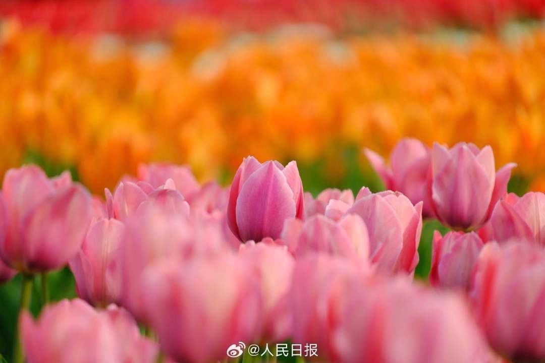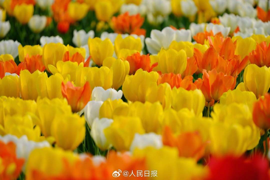 8日,北京。国家植物园的郁金香大片盛开,郁金香花田宛若大自然春天的调色板。(来源:人民日报微博)
