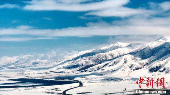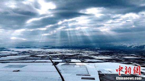 近日,在青海省海北藏族自治州门源县境内,摄影师用航拍镜头记录下巍峨祁连山的春日雪景,阳光透过云层,照射在白雪覆盖的世界,静谧纯净。蓝天、白云、山峦、大地相互映照,山河壮丽尽收眼底。图为祁连山腹地和谐春景。