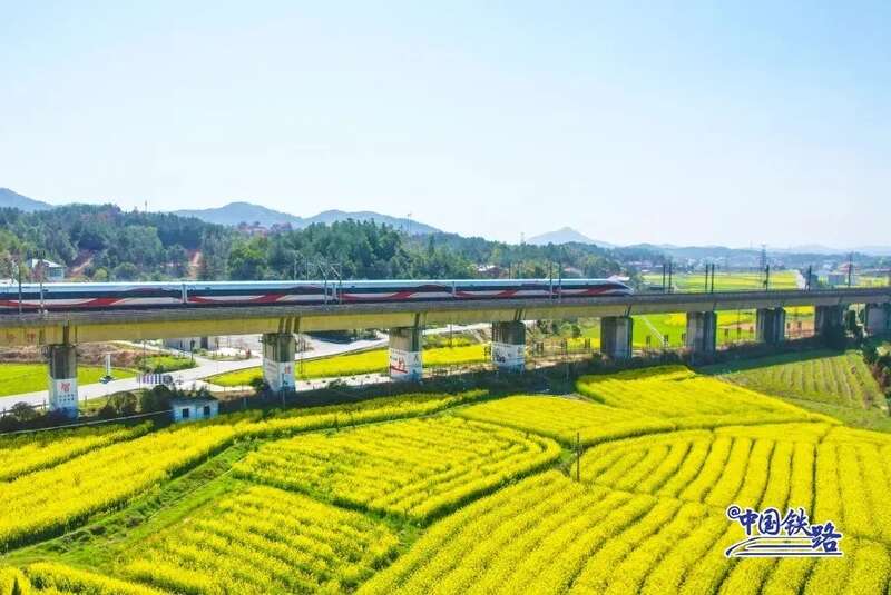 连接江西省赣州市与广东省深圳市的赣深高铁,沿线风景优美。在东莞南至深圳北区间,列车会经过深圳光明欢乐田园,这里有大片油菜花田,不仅在列车上可以赏花,众多市民也可以前往景区,在花海中与列车同框,氛围感十足。