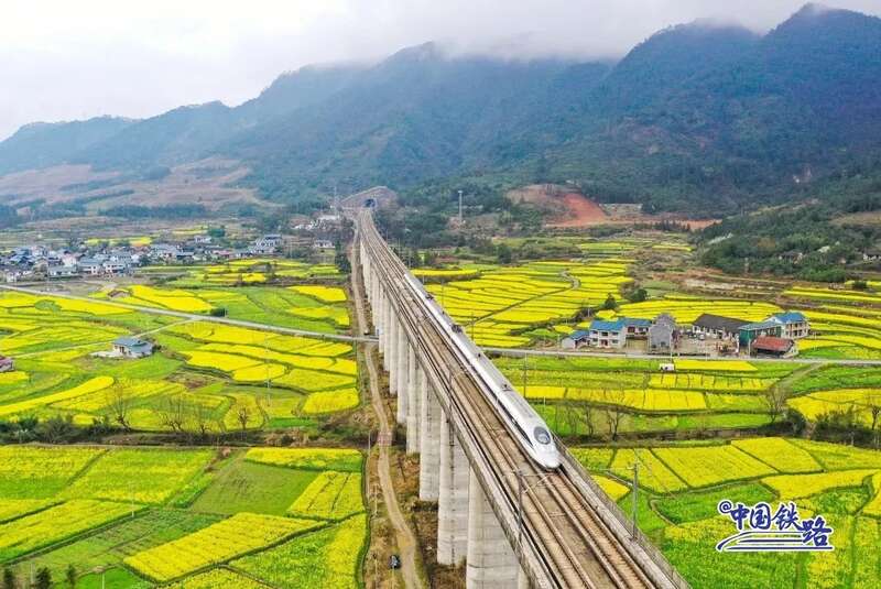 疾驰在沪昆高铁上的动车组穿越油菜花田。李小平 摄