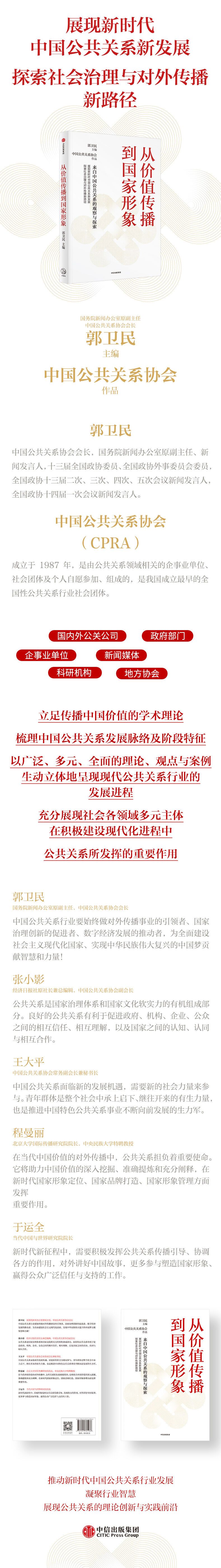 近日,中国公共关系协会会长、国务院新闻办公室原副主任郭卫民主编的《从价值传播到国家形象》一书已由中信出版集团出版。