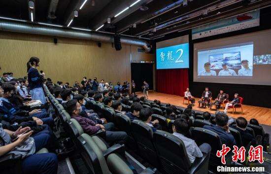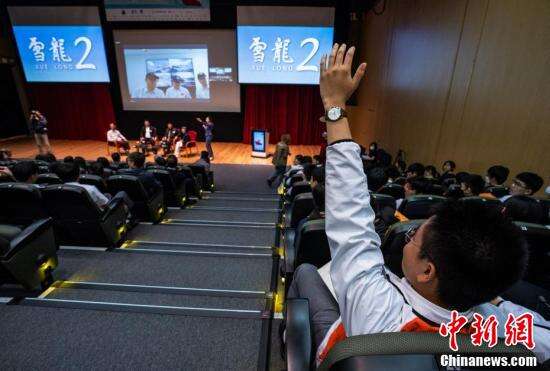 4月10日,在香港科学馆参加与南极考察队科学家交流活动的香港青少年获得与驻留南极中山站的科考人员视频连线对话的机会。当天,随“雪龙2”号科考船抵达香港访问的中国第40次南极考察队的科学家与当地青少年学生对话交流,让青少年有机会深入了解国家在极地科研方面的成就。图为一名学生向中山站科考人员提问。