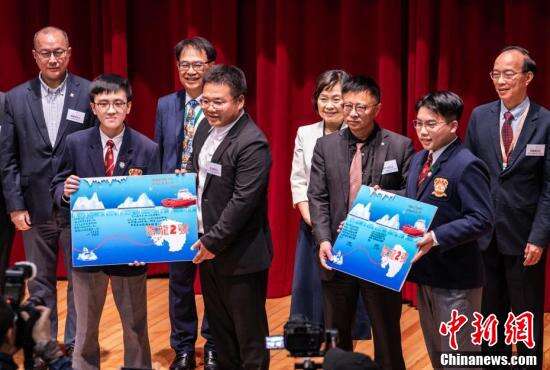 4月10日,随“雪龙2”号科考船抵达香港访问的中国第40次南极考察队的科学家在香港科学馆与当地青少年学生对话交流,让青少年有机会深入了解国家在极地科研方面的成就。图为香港学生代表向南极考察科学家杨惠根(前排右二)、李正阳(前排左二)赠送自制的纪念品。