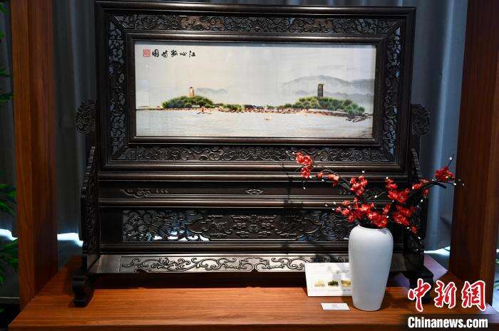 图为以温州市景点“江心屿”为题材的瓯绣作品《江心孤屿图》。中新网记者 李志华 摄