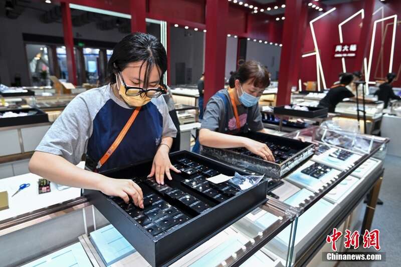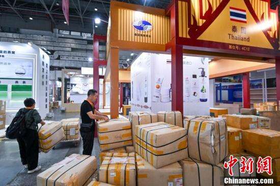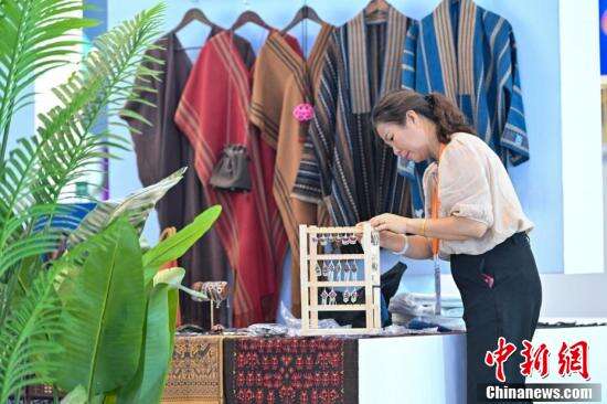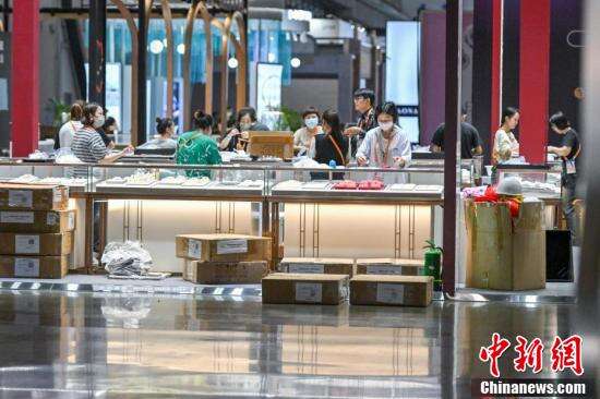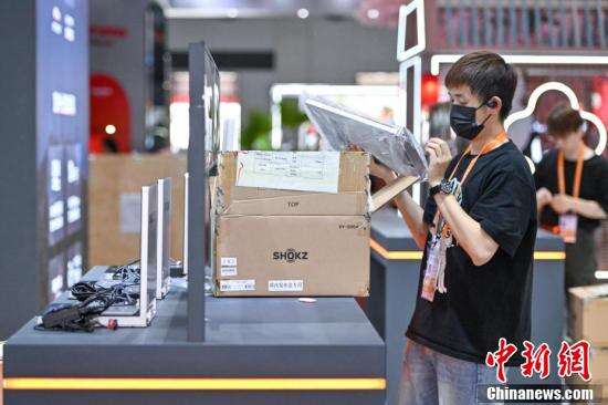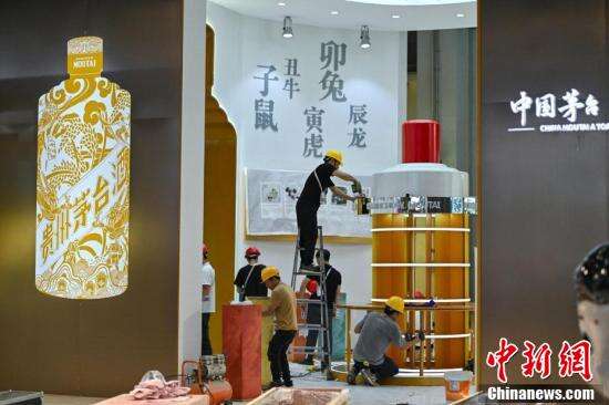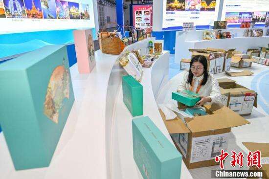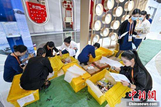 海控全球精品免税城的工作人员正在整备参展的商品。