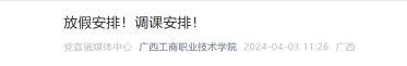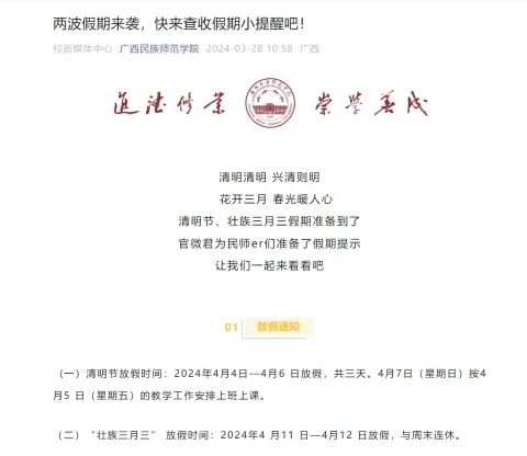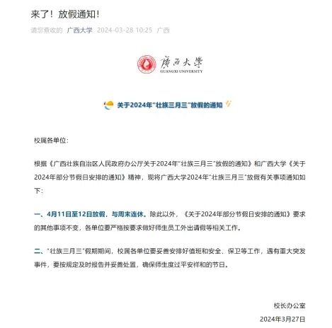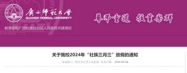 近日,广西大学、广西民族师范学院、广西师范大学、广西工商职业技术学院等多所广西高校发布通知称,“‘壮族三月三’ 放假时间:2024年4月11日—4月12 日放假,与周末连休”,即4月11日至14日放假4天。