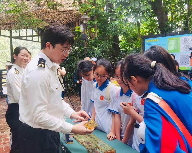 在昆虫标本展示环节,番禺海关综合技术服务中心的农艺师一边展示标本,一边说明外来物种给国家生态安全带来的危害,“看这只手掌大的虫子,它的中文名叫高卡萨斯南洋大兜虫,主要分布于南亚和东南亚地区,是世界上最大的甲虫之一,是海关在寄递渠道截获的外来物种。”不少小朋友表示,今后将关注生物安全问题,争当“国门小卫士”,守护好人类的美丽家园。