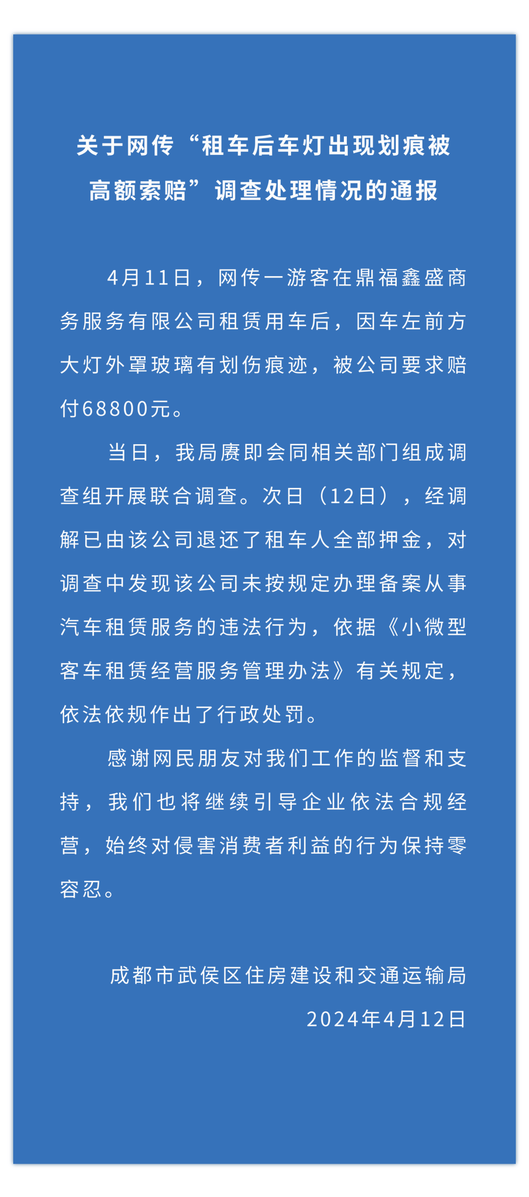 四川省成都市武侯区住房建设和交通运输局4月12日晚发布通报,4月11日,网传一游客在鼎福鑫盛商务服务有限公司租赁用车后,因车左前方大灯外罩玻璃有划伤痕迹,被公司要求赔付68800元。当日,我局赓即会同相关部门组成调查组开展联合调查。次日(12日),经调解已由该公司退还了租车人全部押金,对调查中发现该公司未按规定办理备案从事汽车租赁服务的违法行为,依据《小微型客车租赁经营服务管理办法》有关规定,依法依规作出了行政处罚。