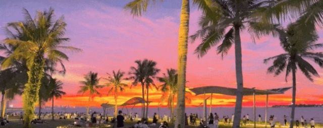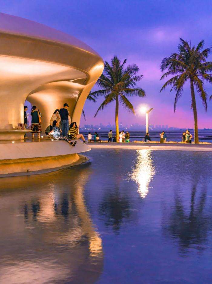 天刚黑,海口人最爱和家人朋友散步在海边,或在沙滩玩沙,或享受海风吹拂,一起度过静谧时光。