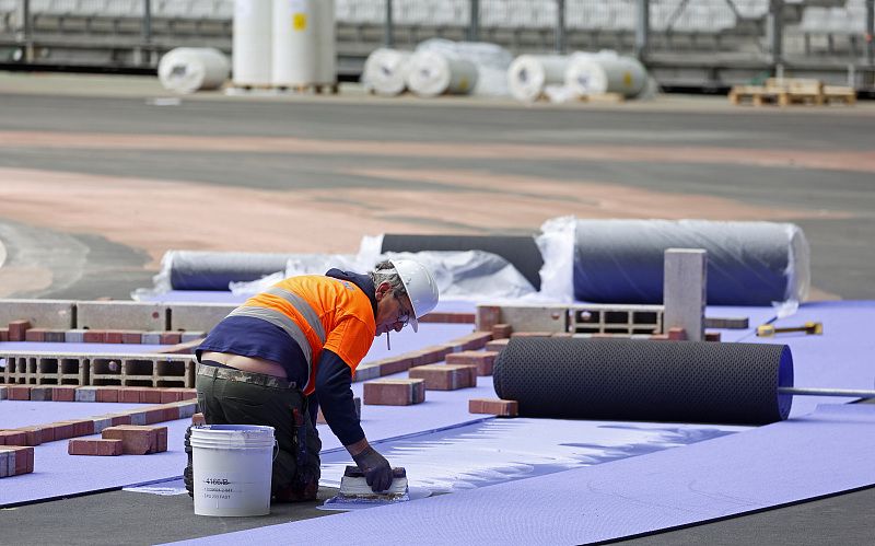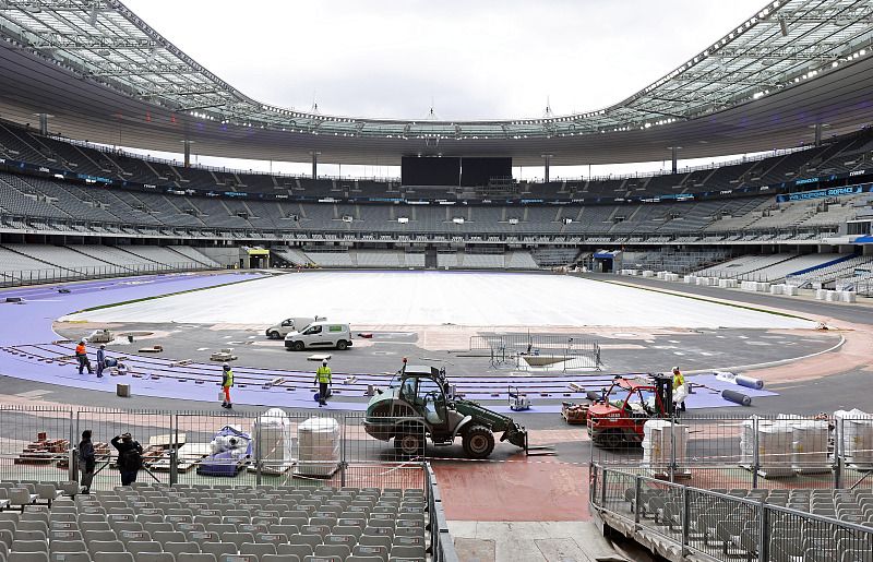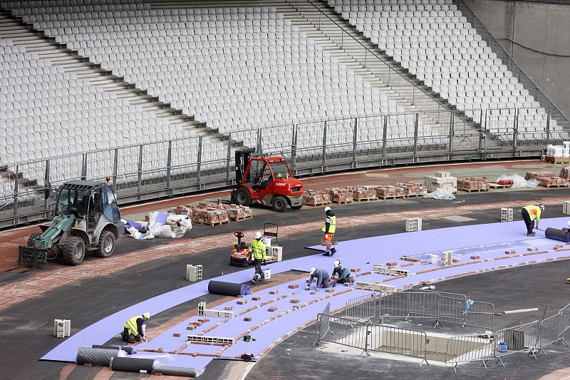 当地时间2024年4月9日,法国巴黎,工人们正在法兰西大球场修建田径跑道。法国巴黎在为举办从7月26日到8月11日的第三十三届夏季奥林匹克运动会做准备。