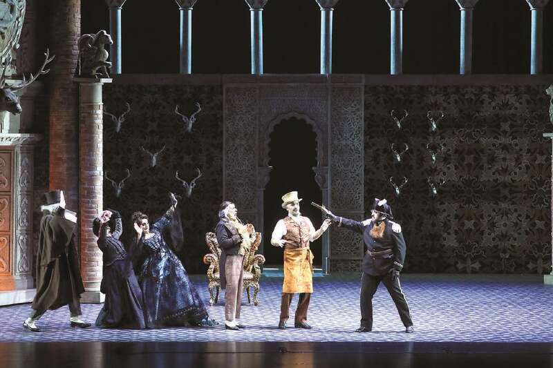 舞台上,一面停摆的时钟悬挂于空中,与背景墙上的一轮圆月呼应。作为第39届上海之春国际音乐节闭幕剧目,中意合作罗西尼歌剧《塞维利亚的理发师》筹备已久。该剧由上海音乐学院院长廖昌永担任艺术总监、上音与科莫歌剧院联合制作,于4月13日至16日在上音歌剧院连演四场。外方导演、舞美设计伊凡·斯泰法努蒂介绍,此次中意合作歌剧呈现在尊重传统的基础上,注入新创意和视角。“罗西尼的这部经典之作,通常会在阳光明媚的舞台环境中演出,而我们与上音合作的版本,开场却是在黑夜中。”夜色中高高悬挂的时钟,在整部剧的演出过程中停摆,直到一切问题在结局时解决,时间才得以继续前进。“在大家的印象中,罗西尼的音乐很幽默、阳光明媚。其实,他的音乐具有丰富的层次,我们试图通过崭新的视角来呈现罗西尼喜歌剧中的黑色幽默。”