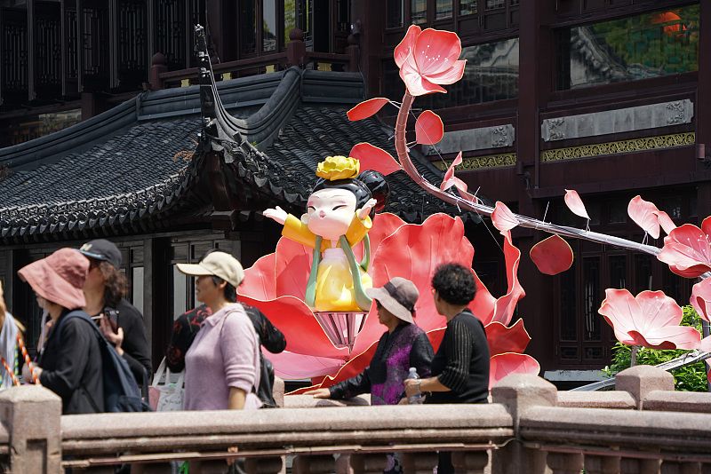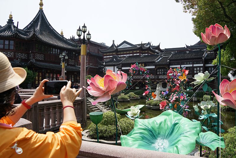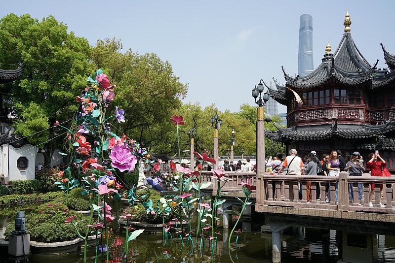 2024年4月15日,上海,豫园举办“仲春花朝节” ,九曲桥畔和中心广场上的美丽百花场景让中外游客流连忘返。据悉,豫园“仲春花朝节”围绕“节气江南”这一文化IP,以上古花神赐福百花,福泽大地为引,由牡丹小仙领衔众花仙子,结合三大主题景致,开启融市集、彩灯、演艺、互动于一体的“花花世界”。