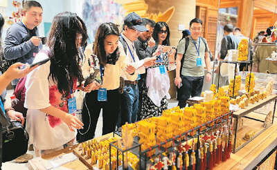 图为两岸记者在观摩“只有河南·戏剧幻城”的文创产品。