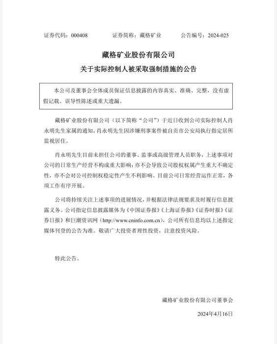 中新网4月17日电(中新财经记者 左宇坤)4月16日,藏格矿业发布公告称,近日收到公司实际控制人肖永明家属的通知,肖永明因涉嫌刑事案件,被自贡市公安局执行指定居所监视居住。