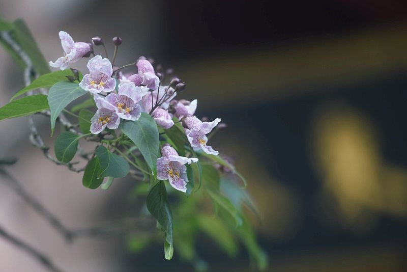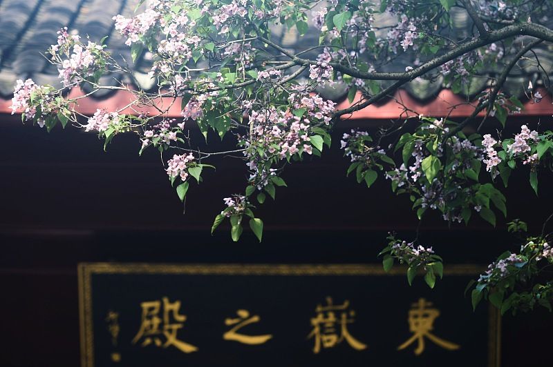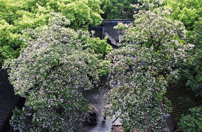 2024年4月18日,杭州,东岳庙两棵530多岁的古楸树开花。楸树是植物界中著名的“活化石”之一,有“万木之王”的美誉,因花朵华美,自古就是观赏名木。