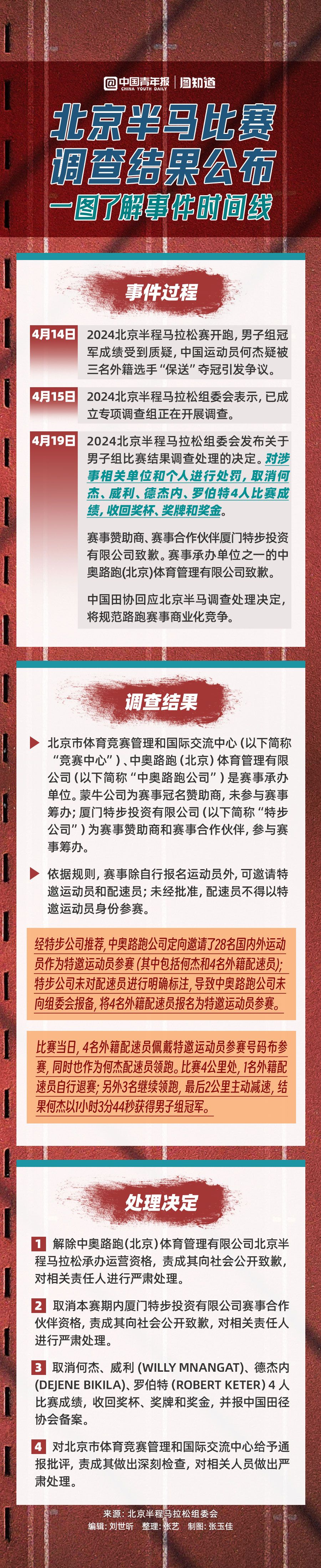 2024北京半程马拉松男子组冠军成绩受到质疑事件5天后,组委会发布调查结果,并对涉事相关单位和个人进行处罚,取消何杰等4人比赛成绩,收回奖杯、奖牌和奖金。此次半马风波背后究竟发生了什么?一图了解。