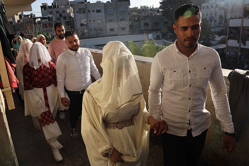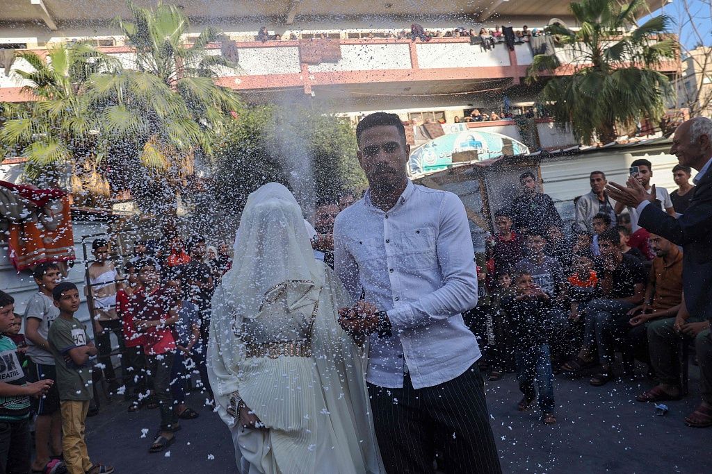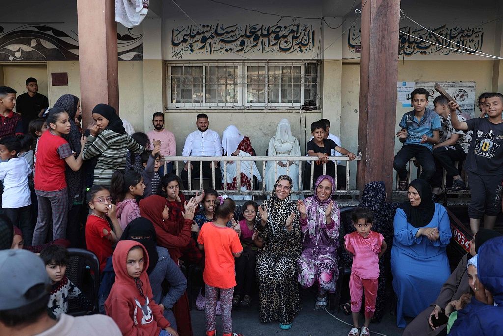 当地时间2024年4月19日,加沙地带拉法,巴以冲突持续,三名巴勒斯坦男子带着他们的新娘在流离失所的加沙人的学校里庆祝婚礼。