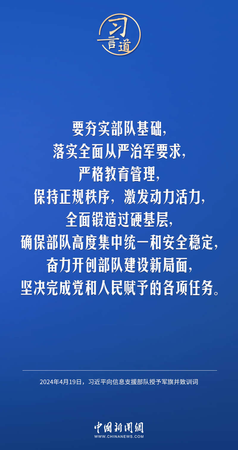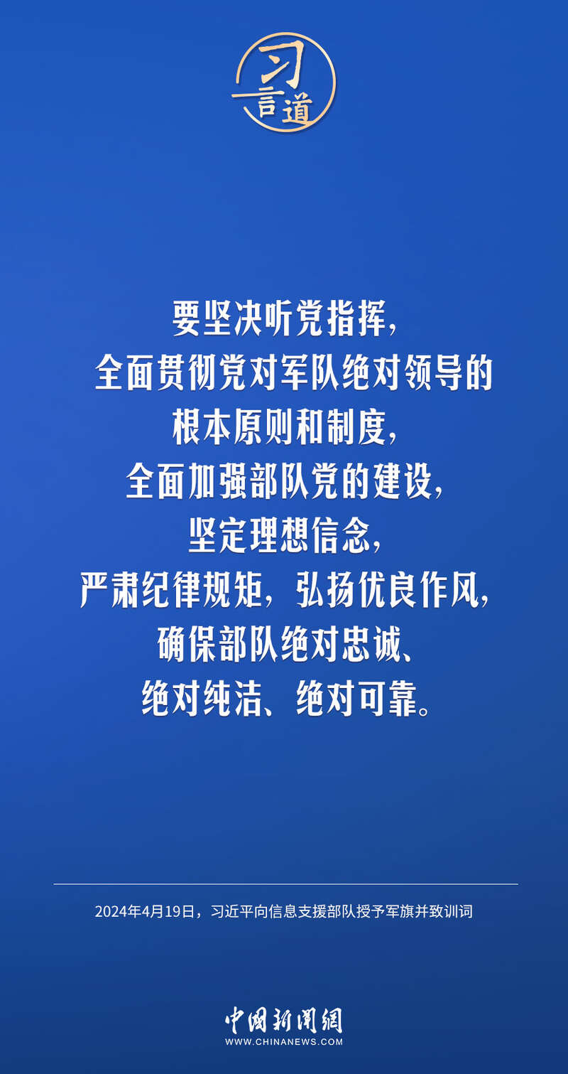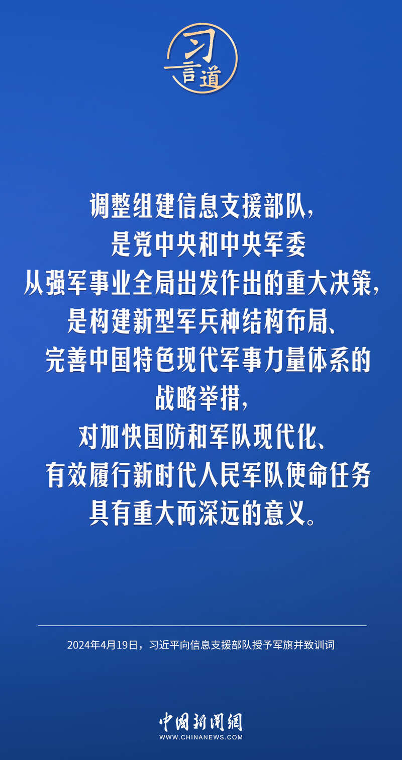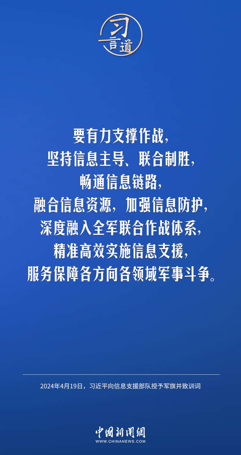 中国人民解放军信息支援部队成立大会19日在北京八一大楼隆重举行。中共中央总书记、国家主席、中央军委主席习近平向信息支援部队授予军旗并致训词,代表党中央和中央军委向信息支援部队全体官兵致以热烈祝贺。他强调——