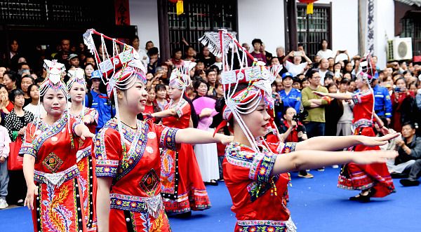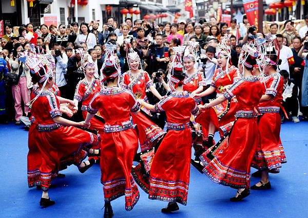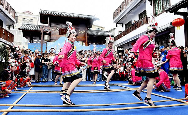 2024年4月20日,江西省德兴市香屯街道兰村,十多名身穿民族服饰的畲族大妈,开心跳起了具有民族特色的竹竿舞。