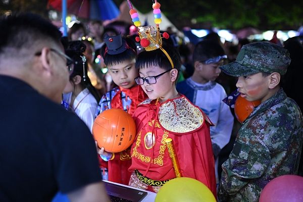 2024年4月20日晚,重庆市沙坪坝区南开小学校,小学生们纷纷化身书中经典人物,参与主题阅读游园会,迎接第29个“世界读书日”。