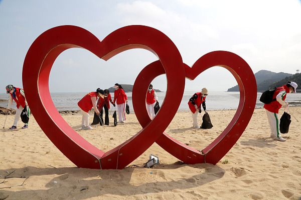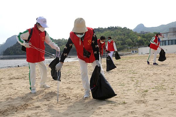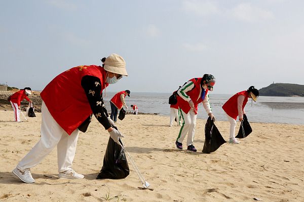 2024年4月21日,在江苏省连云港市连云区沿海海岸线,志愿者在捡拾岸边垃圾。