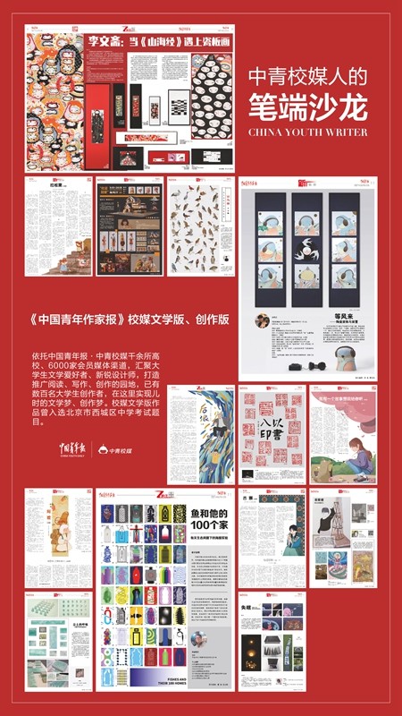2008年,中国青年报社牵头发起高校校园媒体交流合作平台“中青校媒”,目前覆盖全国1000余所高校,联系校园媒体超过6000家,致力于引导青年学生脚踏实地追求向上向善好活法。2021年3月,中青校媒在《中国青年作家报》为校园创作者开设了“校媒文学”和“校媒创作”版块,分别为热爱文学创作和艺术设计的大学生朋友提供创作平台。截至目前,已有数百名大学生创作者在这里发表了作品,“校媒文学”版块的作品还曾入选过北京市中学考试题。
