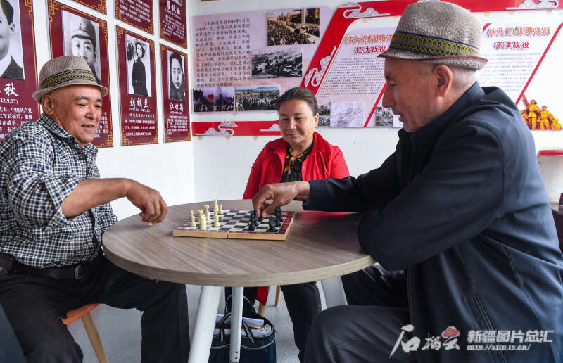 4月24日,在位于柯坪县盖孜力克镇盖孜力克村的文化大院内,当地群众在下棋。