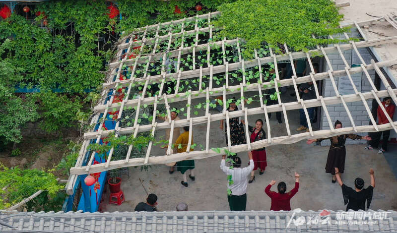 4月24日,在位于柯坪县盖孜力克镇盖孜力克村的文化大院内,当地群众在跳舞(无人机拍摄)。