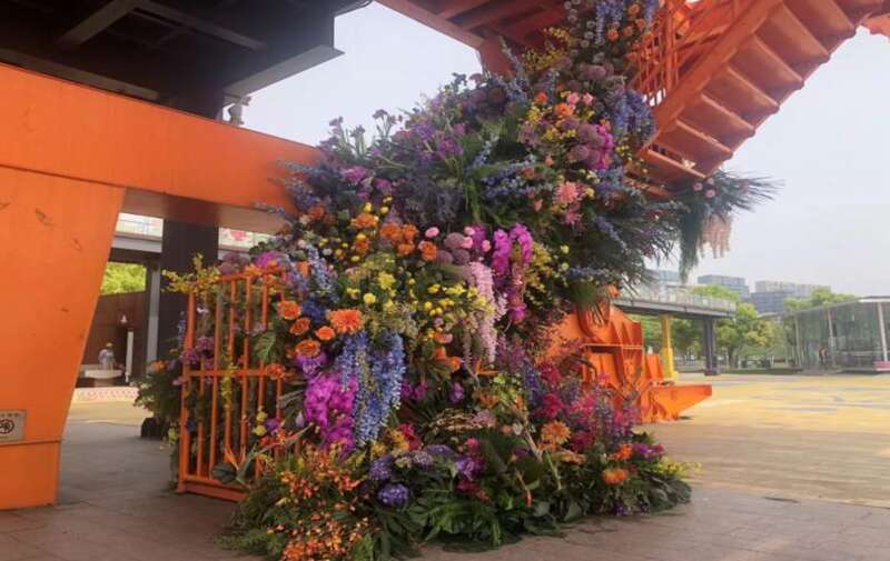 黄浦江畔,徐汇滨江,这里打造了一条长约1500米的“花路”,布置了长三角花园、国际花园等多个花园、花坛、花境。橘色塔吊下的花艺装置上,布置了假花、真花的混搭场景,成为社交平台上一个著名的网红打卡点。网友们不知道它的具体名称,直接给它取名“开满鲜花的塔吊”,配上地图定位,它就火了。