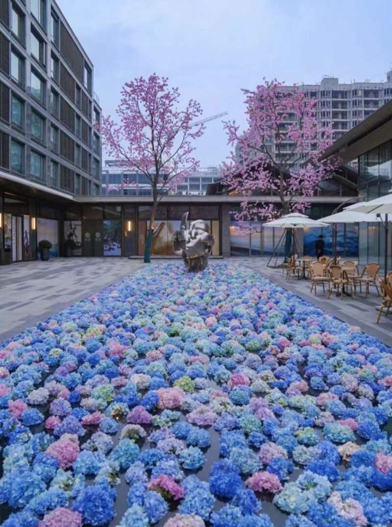 此外,还有铺满绣球的鲜花水池、蝴蝶飞上屋檐的花卉布置也很受欢迎。有意思的是,这些装置,都不是花展主办方布置的,而是滨江商家们主动配合花展打造的网红打卡点。