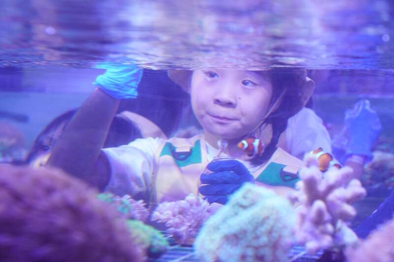 现场,小朋友们换好课程专属的衣服,探索奇妙的珊瑚世界。他们通过游戏认识“奇形怪状”的珊瑚,在珊瑚实验室里近距离观察,了解珊瑚保育的秘密,还可以亲手给珊瑚喂食,体验珊瑚复育。随后,孩子们手持放大镜观察珊瑚池的景观,并参与了珊瑚种植和清洁工作。