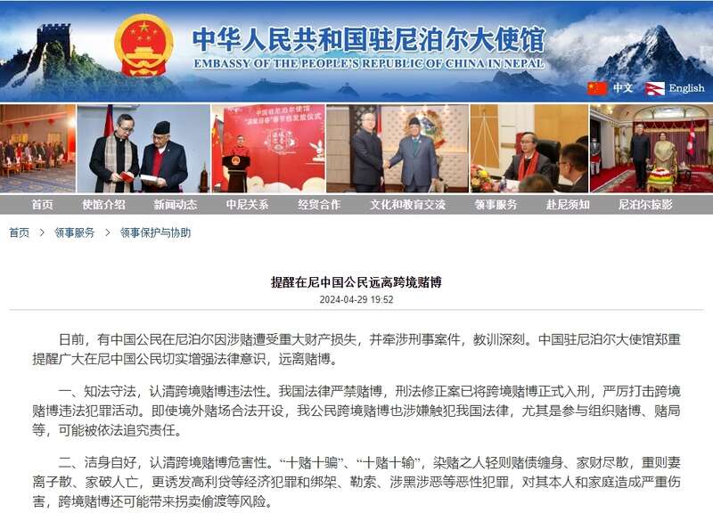 4月29日,中国驻尼泊尔大使馆发表声明,提醒在尼中国公民远离跨境赌博。
