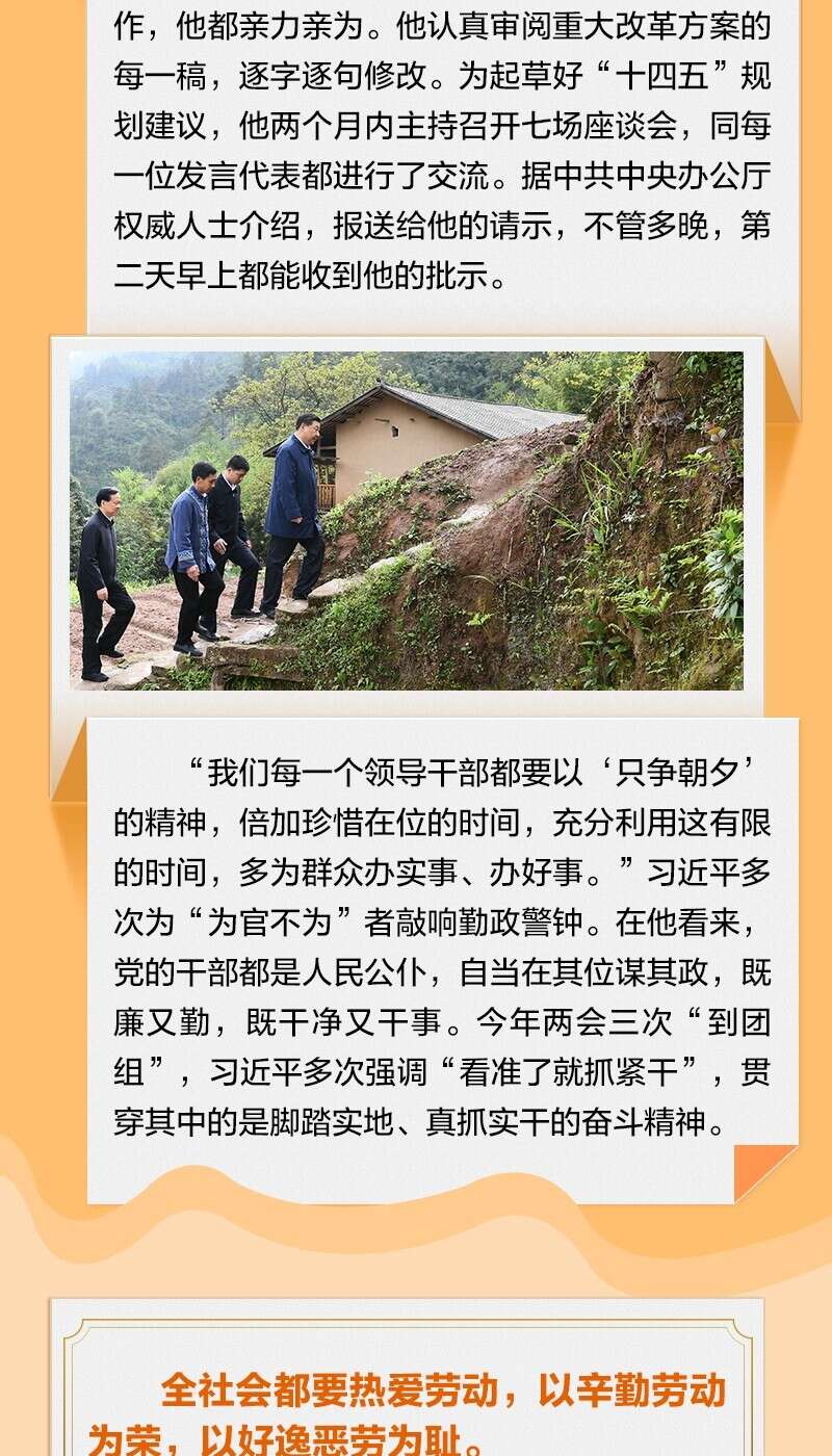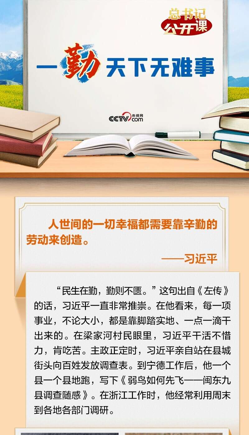 习近平总书记强调,“一勤天下无难事”,“实现中华民族伟大复兴的中国梦,要靠各行各业人们的辛勤劳动”。“勤”是贯穿总书记从政生涯的品质,是对他夙夜在公、勤勉工作最为凝练的概括。