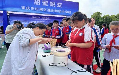 4月26日,龙洲湾中学学生在重庆市巴南区融创初级中学展区体验棉花糖制作。谭权洁/摄