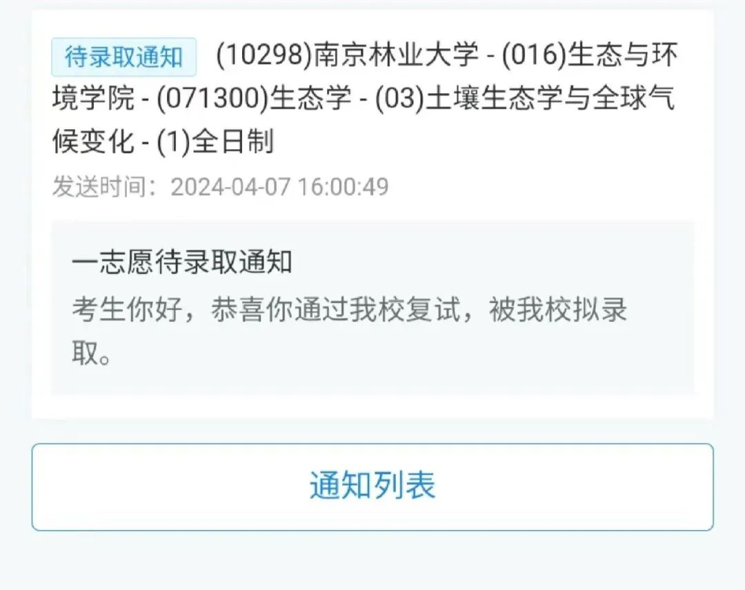 最近,程同学成功考上南京林业大学