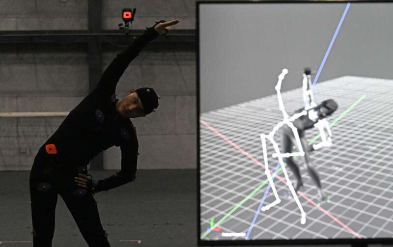 动捕演员马鑫琪在动作捕捉棚内做动作时,一个做着相同动作的虚拟角色在电脑上实时生成(4月23日摄)。