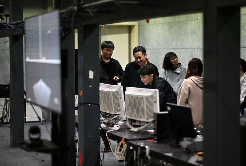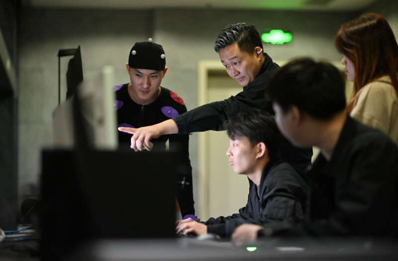 崔盛辑(左二)和同事在动作捕捉棚内查看动作捕捉数据(4月23日摄)。