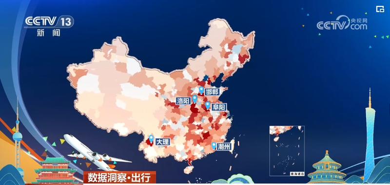 代表旅客净流入的红色占据了绝大多数,达到城市总数的八成,甚至比4月30日还高了一成。在这些城市当中,洛阳、潮州、大理、阜阳、邯郸等城市成为旅客净流入量较大的目的地,这意味着在假期第一天,有更多人从中心城市前往了中小城市。